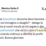 “Amiche #zeudiners, siccome devo lavorare – come voi immagino, o sbaglio? – affido al mio legale e alla @PoliziaPostaleX la risposta ai vostri insulti. Svolge benissimo il suo lavoro, rintracciando indirizzi e identità dei profili offensivi. Buona giornata”.